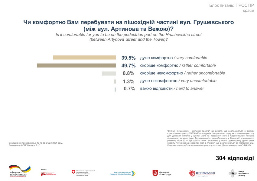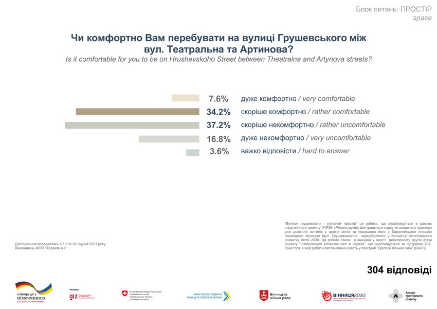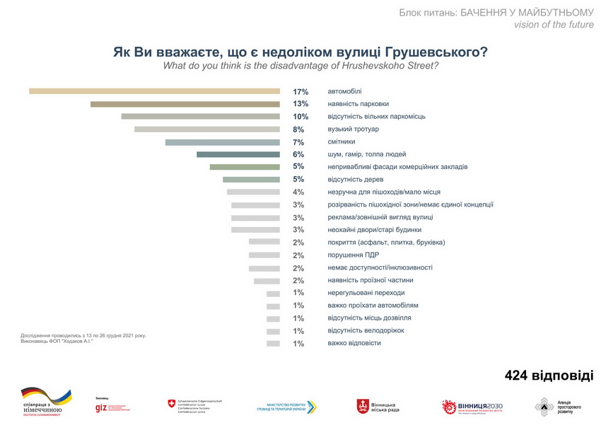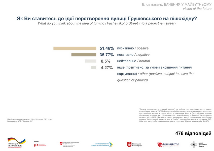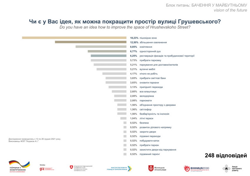 Директор КП «Агенція просторового розвитку» Максим Кравчук додає, що до ідеї перетворити вулицю Грушевського на пішохідну зону, 52% опитаних ставиться позитивно, 36% - негативно. На питання, як покращити цю вулицю, найчастіше вінничани зазначили, що її варто зробити пішохідною. Частина респондентів проголосувала за збільшення озеленення, освітлення, односторонній рух, реставрацію фасадів та прибудинкових територій.