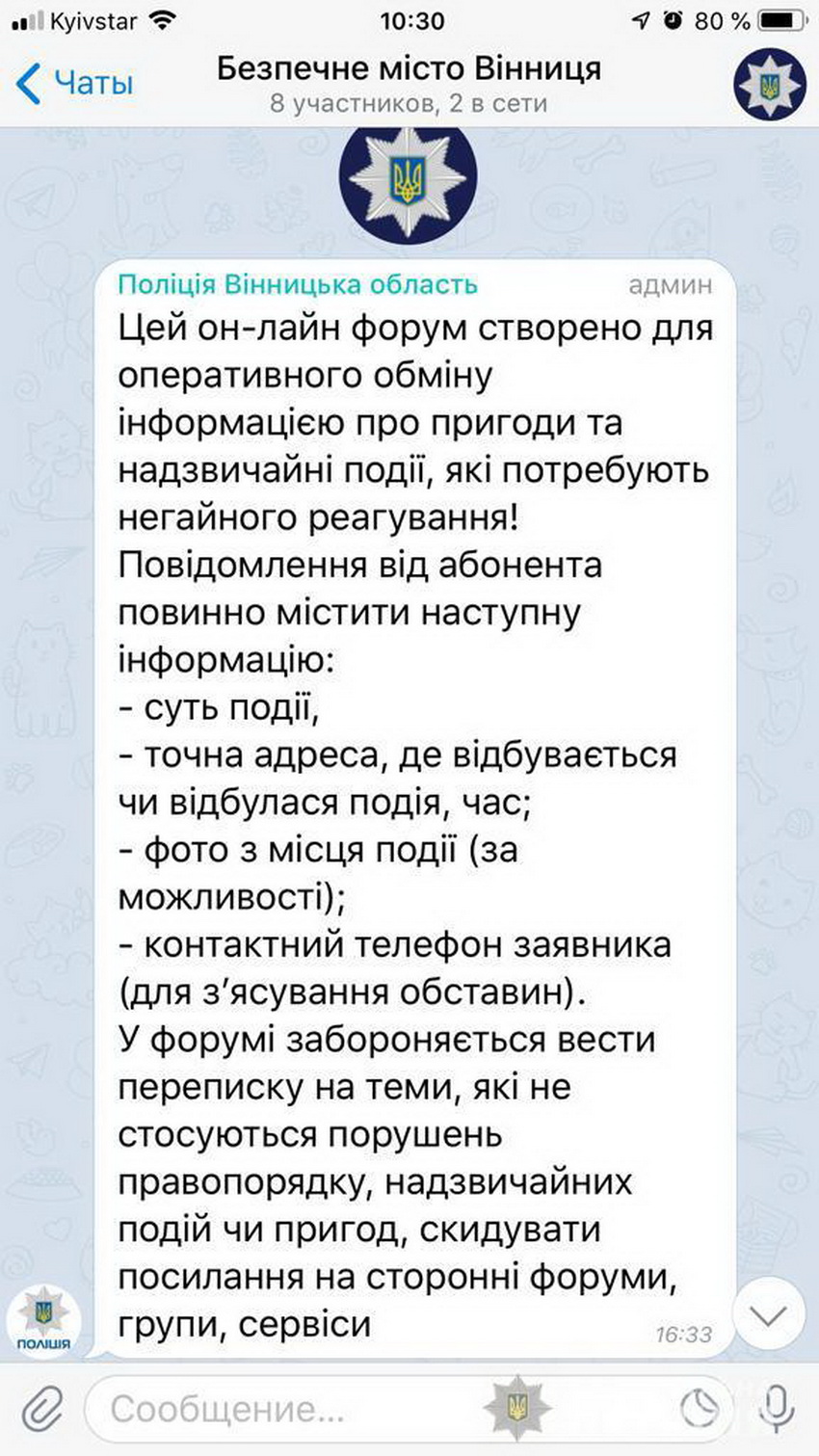 З 1 липня в месенджері «Telegram» запрацював онлайн-форум «Безпечне місто». Відтепер вінничани, крім дзвінка на номер 102, можуть повідомити про надзвичайну подію чи пригоду у відкриту групу «Безпечне місто Вінниця» у Telegram. Протягом місяця група працюватиме у тестовому режимі, а з серпня запрацює у повному обсязі.
