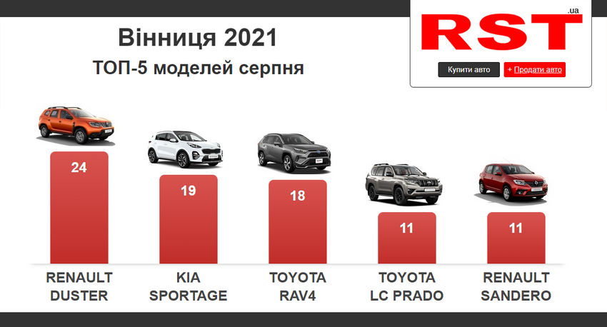 В серпні місяці у Вінниці та області зареєстрували 220 нових автомобілів. На покупку цих авто в регіоні витратили 7 млн доларів, а найпопулярнішою моделлю був кросовер Renault Duster.