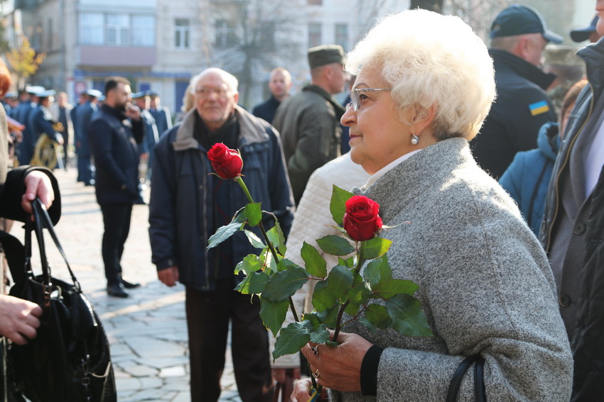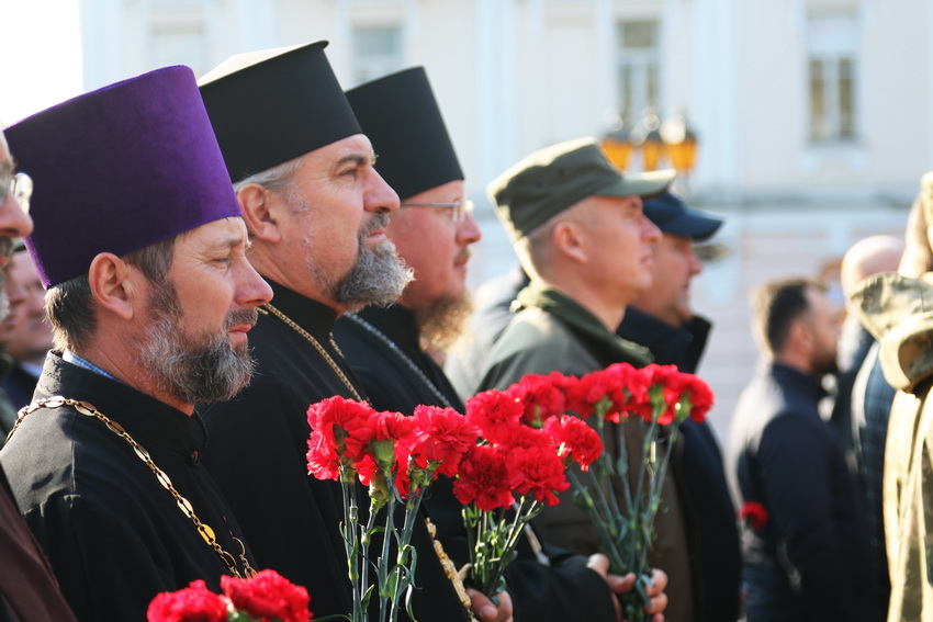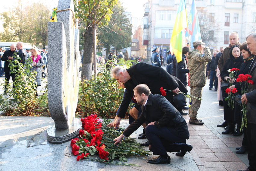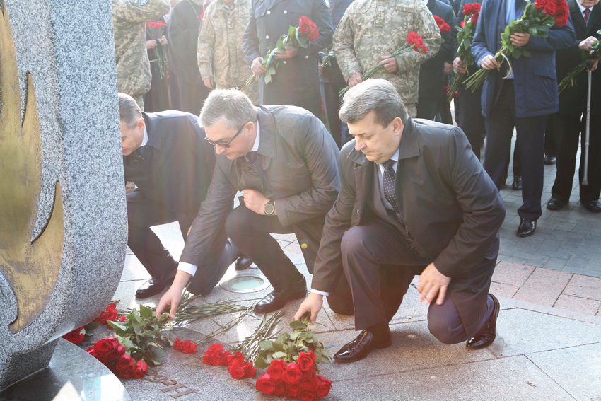 Вранці у Вінниці відбулося покладання квітів до Меморіалу Слави та пам’ятного знаку загиблим воїнам АТО. Прийшли майже сотня вінничан – представники влади міста та області, представники релігійних конфесій громадських організацій та учні навчальних закладів.