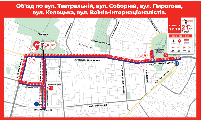 Із 13:30 до 15:00 години залишиться тимчасово перекритим просп. Космонавтів (від перехрестя з вул. Василя Порика до Хмельницького шосе) – для проведення забігів на дистанцію 1 км та дитячих забігів на 500 м і 100 м.