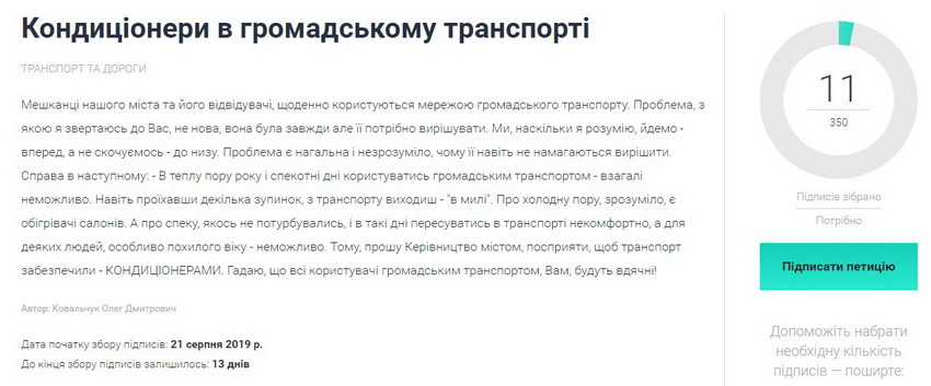 Справа в наступному: В теплу пору року і спекотні дні користуватись громадським транспортом - взагалі неможливо. Навіть проїхавши декілька зупинок, з транспорту виходиш – «в милі». Про холодну пору, зрозуміло, є обігрівачі салонів. А про спеку, якось не потурбувались, і в такі дні пересуватись в транспорті некомфортно, а для деяких людей, особливо похилого віку – неможливо. Тому, прошу Керівництво містом, посприяти, щоб транспорт забезпечили – кондиціонерами. Гадаю, що всі користувачі громадським транспортом, Вам, будуть вдячні», – йдеться в петиції Олега Ковальчука.