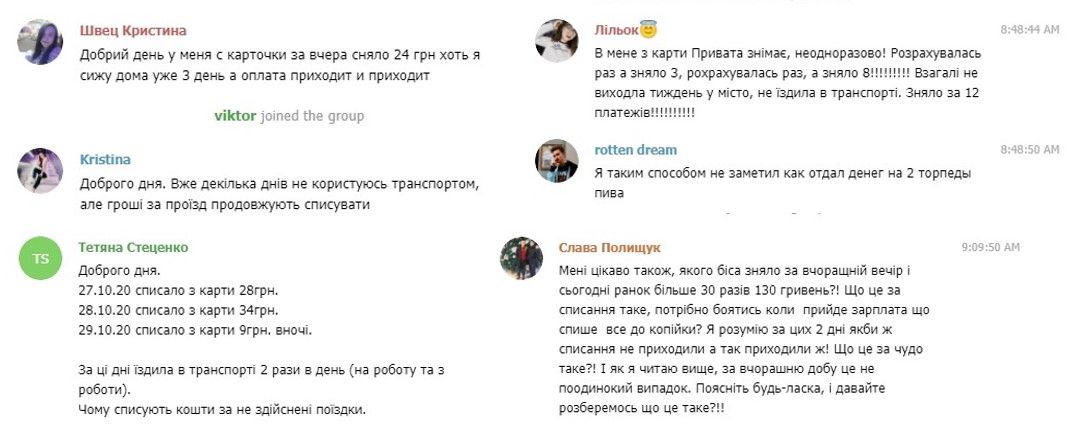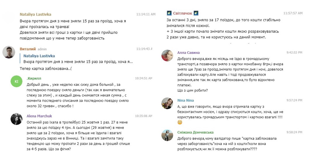 В Телергам-чаті техпідтримки «Муніципальна картка вінничанина» люди звертаються також зі скаргами про те, що після кількох спроб оплатити проїзд банківською карткою, відбувалося блокування.