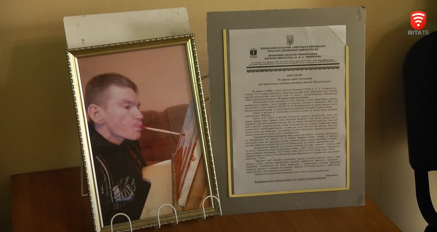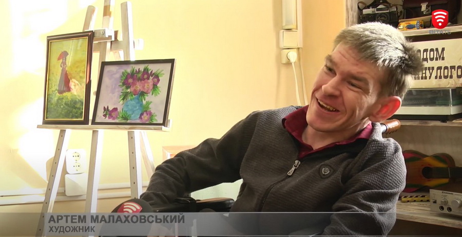 Вінничанин Артем Малаховський малює пейзажі та натюрморти, тримаючи пензлик в зубах. Створювати йому картини допомагає арт-терапевт, адже чоловік має важку форму ДЦП. Нещодавно у чоловіка відкрилася виставка, де було представлено три десятка робіт.