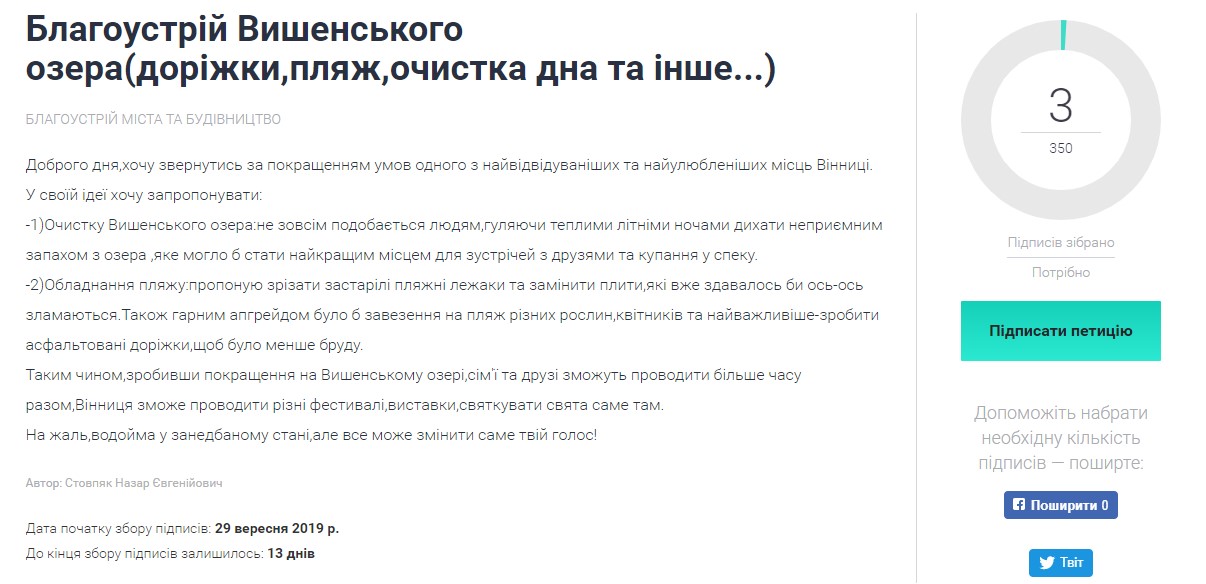 Таким чином, зробивши покращення на Вишенському озері, сім'ї та друзі зможуть проводити більше часу разом, Вінниця зможе проводити різні фестивалі, виставки, святкувати свята саме там», – йдеться в петиції.
