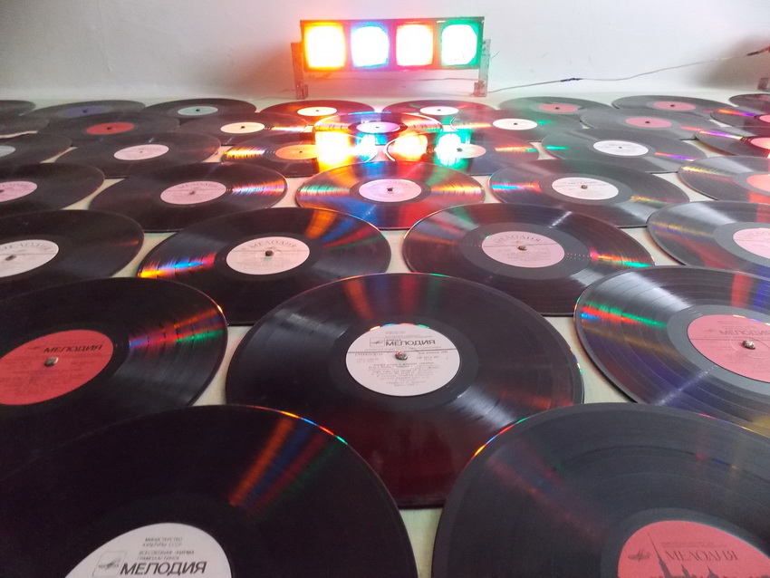 Коли у квартирі темно, платівки підсвічують театральні лампи.
