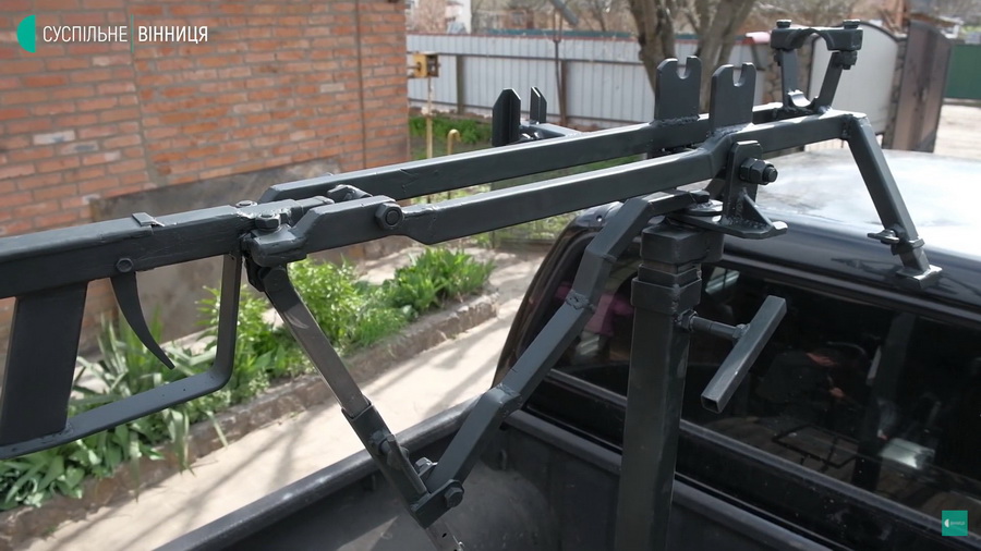 Станину встановлять на кузові пікапа, який прислали військові. Щоб це зробити, Володимир Нагорний власноруч розробив спеціальну стійку, яка кріпиться до автомобіля. Завдяки цьому вона зніматиметься.