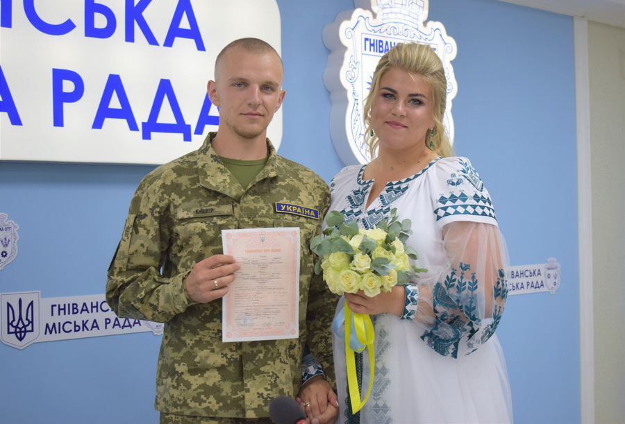 28-річний Роман Кушнір, родом з Гнівані, пішов добровольцем захищати Україну від рашистів. Разом зі своєю коханою Веронікою планували одружитися восени цього року, але з початком війни зрозуміли, що нічого не можна відкладати на потім. Роман приїхав додому на три дні, аби побратися із коханою.
