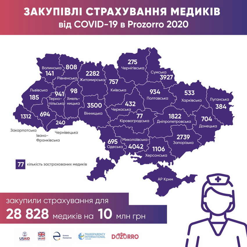 Протягом 2020 року медичні установи України через систему Prozorro застрахували 28 828 своїх співробітників, на що витратили 10 мільйонів гривень. Вінницька область посіла третє місце за кількістю застрахованих від COVID-19 медиків. В регіоні застрахували 3 500 медпрацівників.