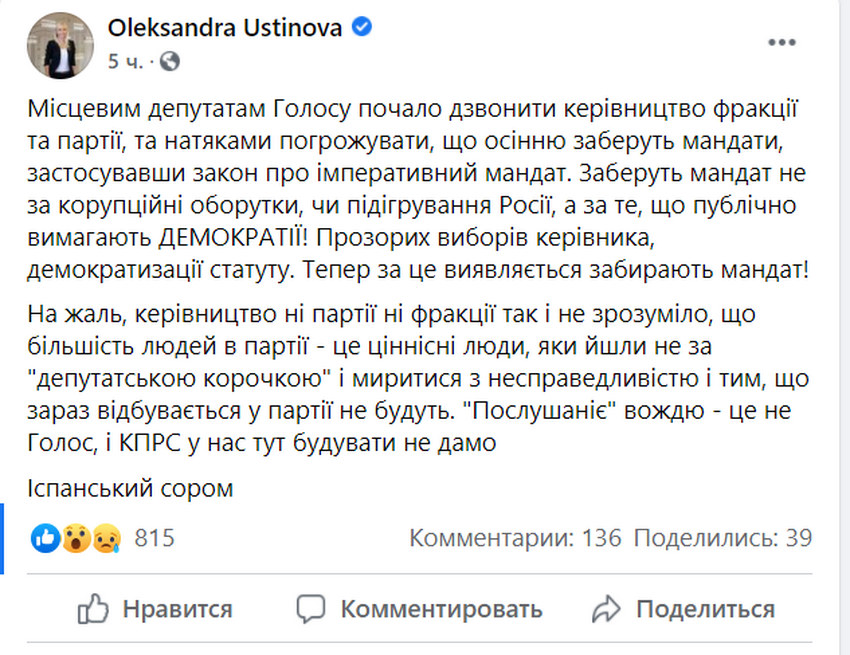 «Місцевим депутатам Голосу почало дзвонити керівництво фракції та партії, та натяками погрожувати, що осінню заберуть мандати, застосувавши закон про імперативний мандат. Заберуть мандат не за корупційні оборудки, чи підігрування Росії, а за те, що публічно вимагають ДЕМОКРАТІЇ! Прозорих виборів керівника, демократизації статуту. Тепер за це виявляється забирають мандат!
