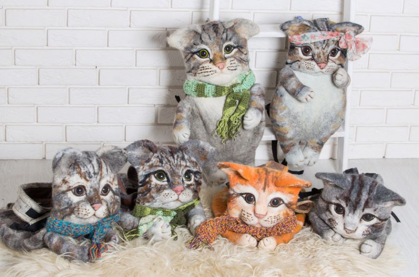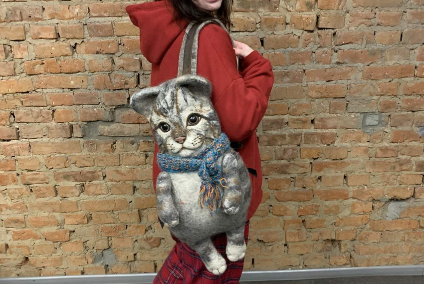 Рюкзаки за образами дворових котів. Майстриня з Вінниці валяє з вовни прототипи тварин. Кожен з таких наплічників – ексклюзив. Наталія Степанюк вже створила семеро різнокольорових пухнастиків. Один з яких поїхав на подарунок для дитини в Іспанію.