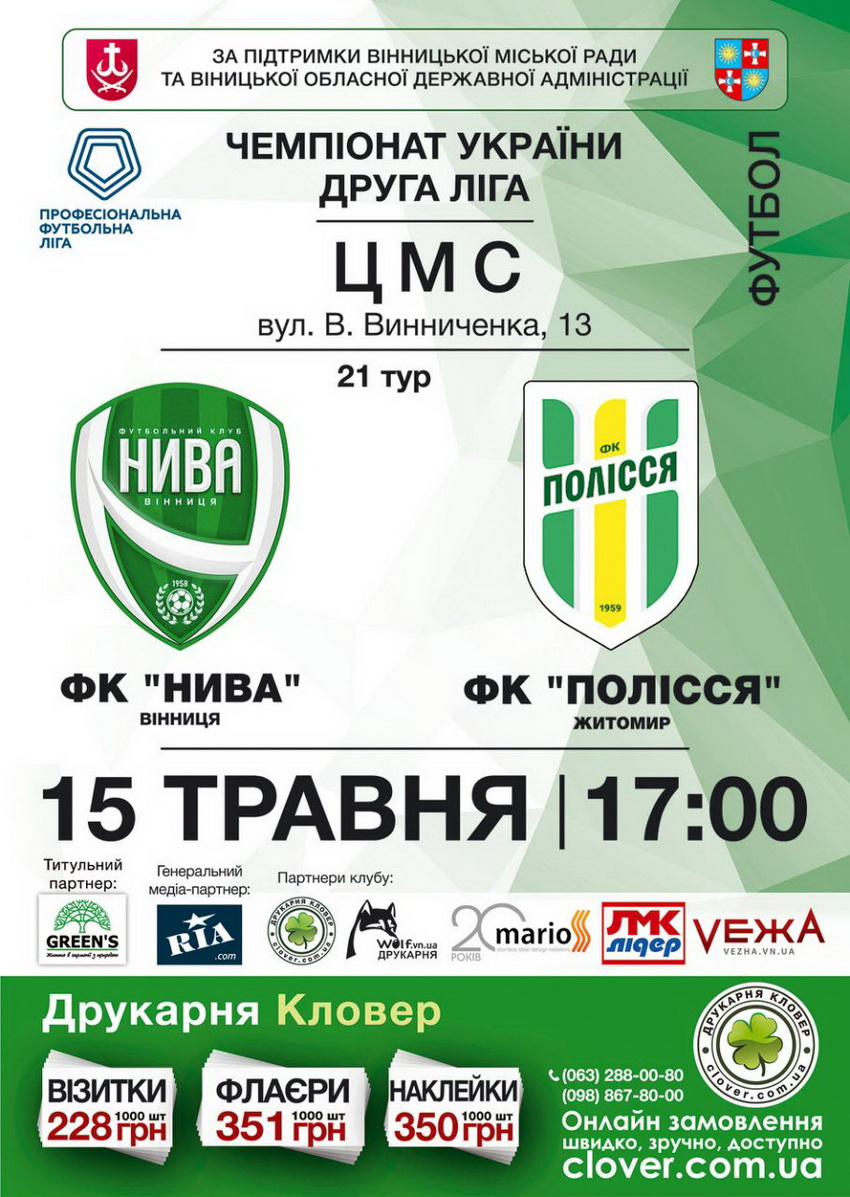 15 травня вінницька «Нива» приймає житомирське «Полісся». Це буде пропущена гра 21-го туру чемпіонату України з футболу (друга ліга). Вона пройде на Центральному міському стадіоні. Початок – о 17.00 годині.