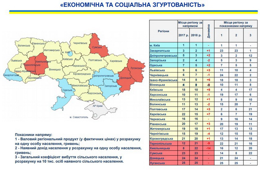 Після оцінки критерію «Економічна та соціальна згуртованість» Вінниччина опинилася на 9 сходинці – це на 5 позначок нижче попереднього періоду. Тут аналізували валовий регіональний продукт у розрахунку на одну особу населення, наявний дохід населення та загальний коефіцієнт вибуття сільського населення, у розрахунку на 10 тисяч осіб наявного сільського населення.
