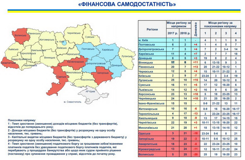 Вінниччина показала кращі результати «Фінансової самодостатності», піднявшись у рейтингу на 11 пунктів. Втім, сьогодні область посідає 6 позицію. Тут оцінювали темп зростання доходів місцевих бюджетів, капітальні видатки місцевих бюджетів.