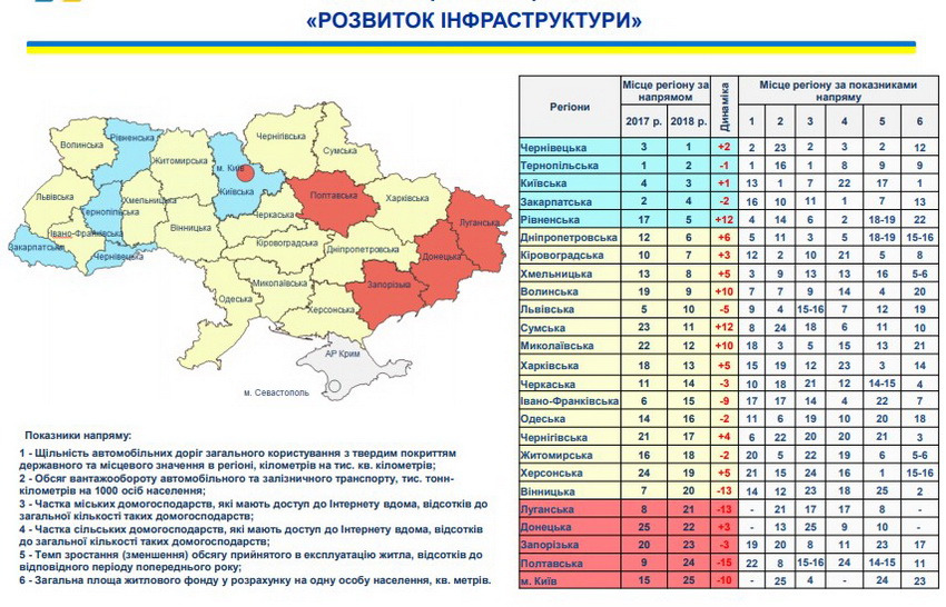 Щодо «Розвитку інфраструктури», то Вінниччина опустилася одразу на 13 позицій і займає 20 місце рейтингу. Аналізували щільність автомобільних доріг з твердим покриттям, обсяг вантажообороту, частку домогосподарств, що мають доступ до Інтернету, темп зростання прийнятого в експлуатацію житла.