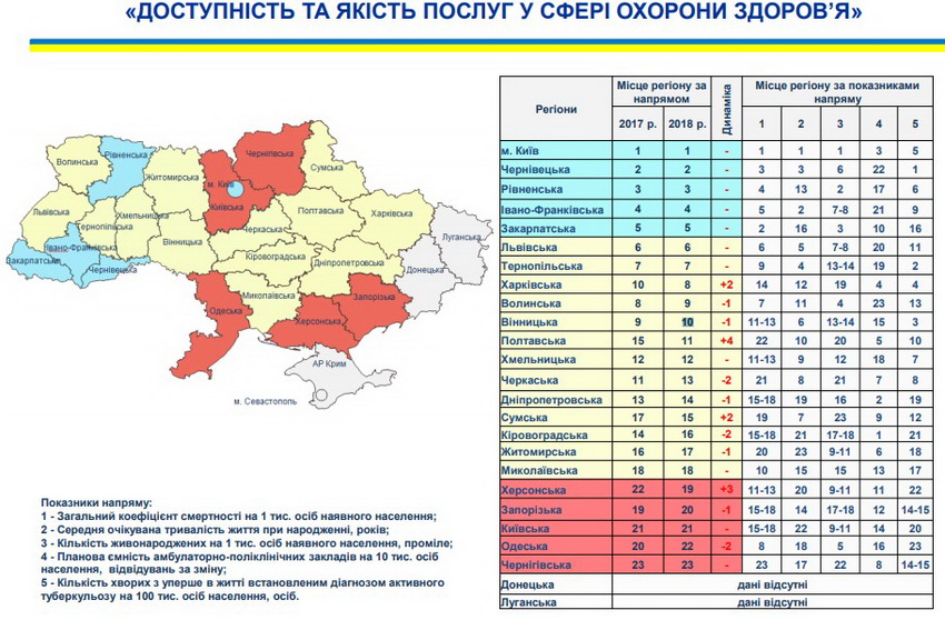 «Доступність та якість послуг у сфері охорони здоров’я» - Вінницька область на 10 місці. Враховували показники смертності, народжуваності, кількість амбулаторій тощо.