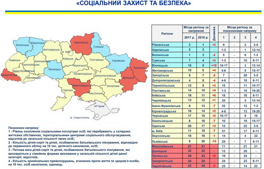 Вінницька область покращила свої показники у «Соціальному захисті та безпеці» і посіла 5 місце. Це на 10 показників вище, ніж у 2017 році.