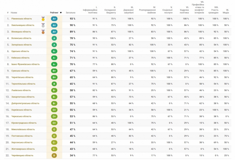 Як показало дослідження, середній показник «прозорості» по регіонах України за останні роки суттєво збільшився. Так, якщо 2016 року він становив близько 45%, то цьогоріч – майже 63%.