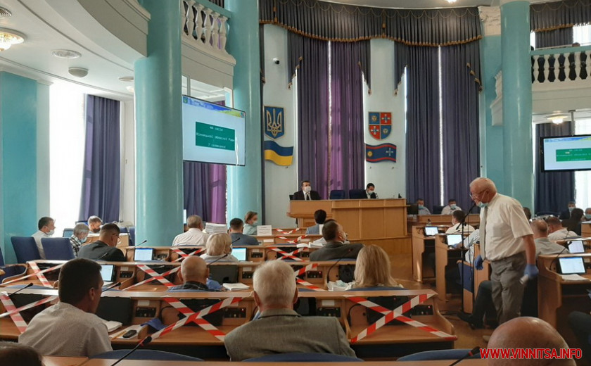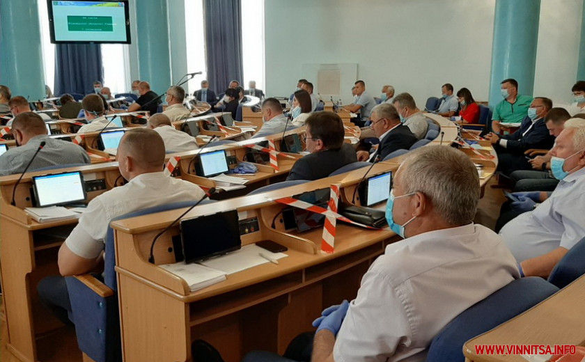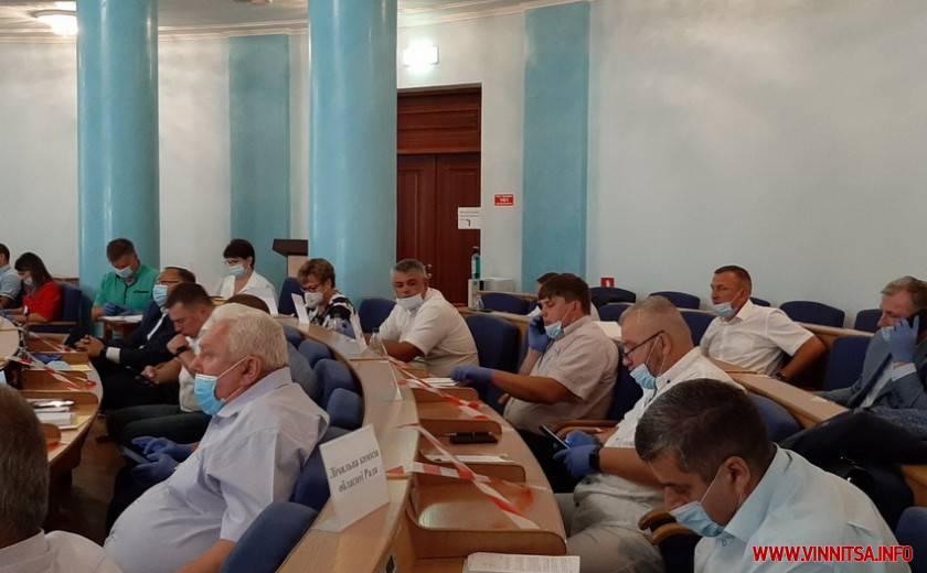Депутати Вінницької облради 23 липня зібрались на сесію Вперше у будівлі облради від початку карантину. Напередодні провели тотальну дезінфекцію сесійної зали. Депутатів розсадили на місця з дотриманням дистанції – через одне місце. Вільні місця «заклеїли» обмежувальними стрічками.