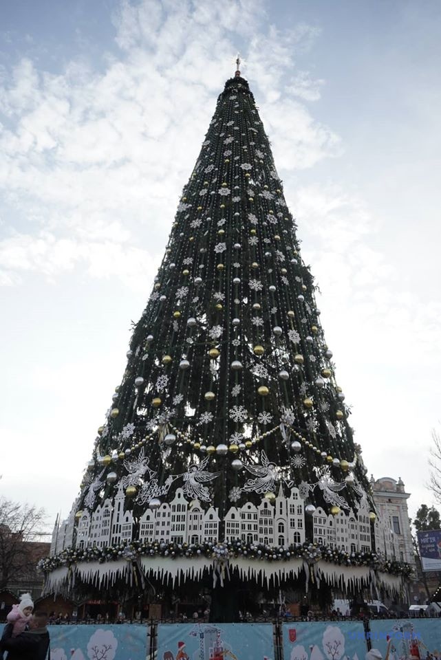 Новорічне дерево прикрасили у золотих, срібних та білих кольорах. Її оздобили сніжинками та 3D гірляндами. Також унизу виготовили обідок, на якому зображені сюжети міста.