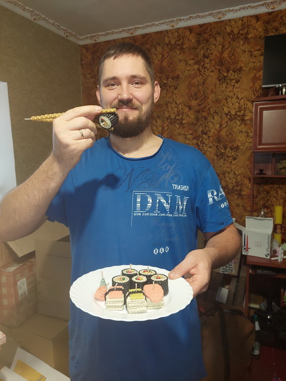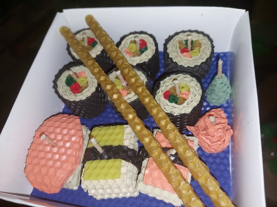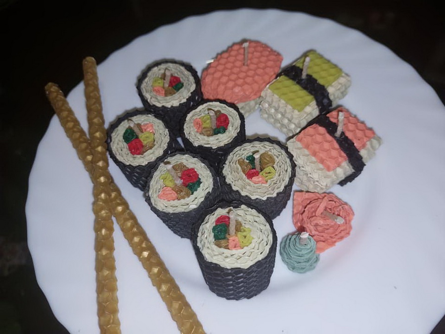 «У людей є різні вподобання по сетам. Тому, ми можемо відтворювати саме ті, які вони люблять. Свічки виходять в оригінальному розмірі зі стравою. Надіслати можемо, у будь-яку точку світу. Найголовніше, дорогою ці суші не «зіпсуються». Використовуємо тільки натуральні матеріали з воску. Тому запах свічки мають аромат меду», - продовжує Добровольський.