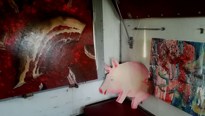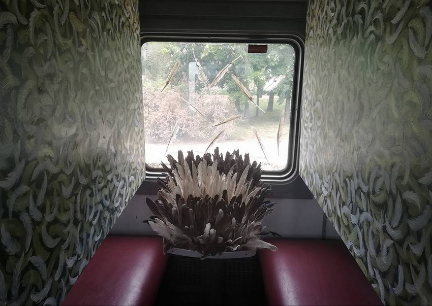 «А також у нас була зона «Шоколад», адже Вінницю асоціюють з ним. А ще «Свинячий », бо у дорогу чимало мандрівників беруть саме цей продукт. Та й помітив, якщо кудись їду і питаю, кому і що привезти, всі просять нашого сала. А ще створили локацію «Без назви». З села Кузьминці мені передали чимало гусячого пір’я. От з нього і створив арт-об’єкт. Пір’я – як символ подушок, спальних місць у потязі. Воно «проросло» через стіл – головний атрибут у купе», - продовжує Никитюк.