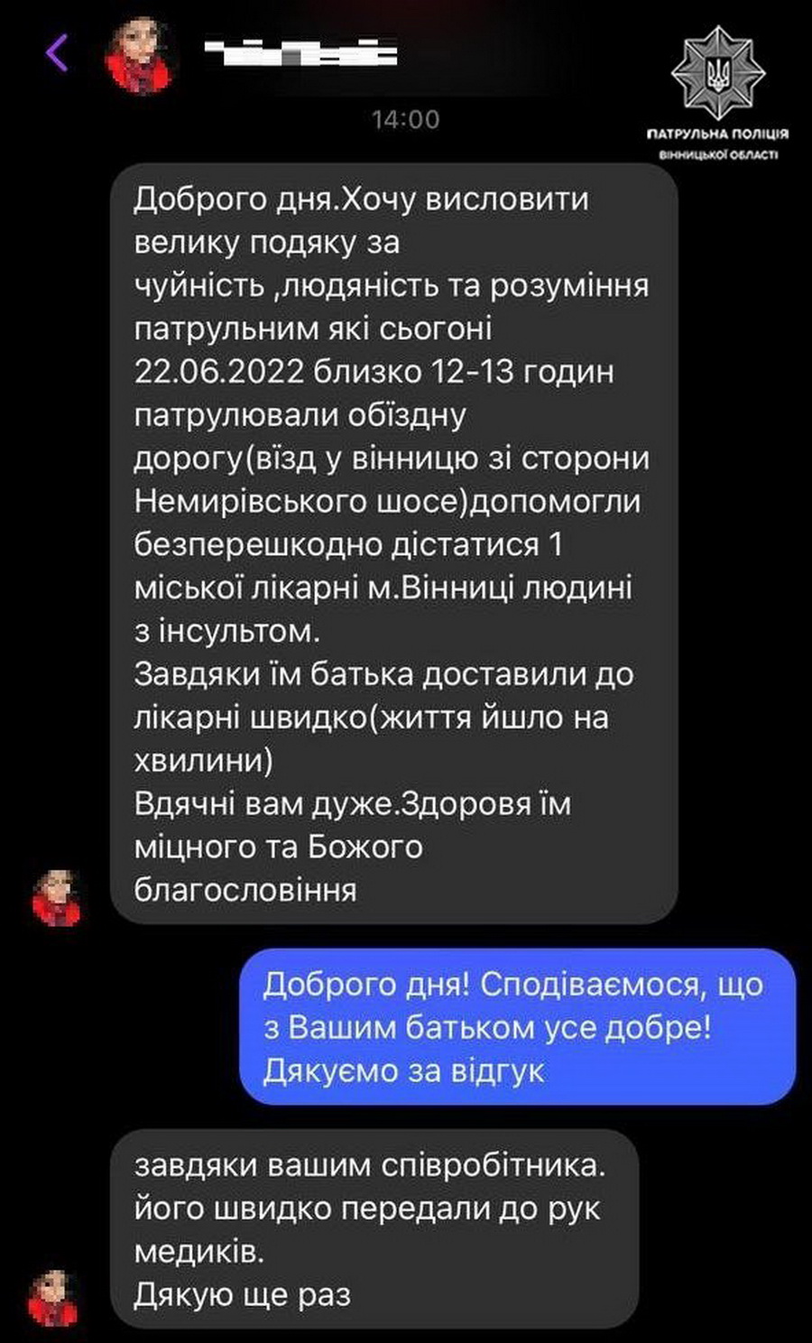 «Після декількох секунд цієї розмови патрульні Сергій Гулько, Віталій Гедзь та Олена Іваницька вже мчали в місто, увімкнувши сирену та проблискові маячки. Супроводжуючи легковик, вони минули декілька світлофорів з увімкненим червоним світлом та виїжджали на зустрічну смугу для руху. Усе задля того, щоб врятувати життя. За 2-3 хвилини автомобіль Audi A6 був біля Вінницької міської клінічної лікарні №1, де чоловіка з інсультом прийняли медики. Ми дуже переймались тим, чи встигли вчасно супроводити цих людей. А потім отримали таке повідомлення на офіційну сторінку», - йдеться у повідомленні.