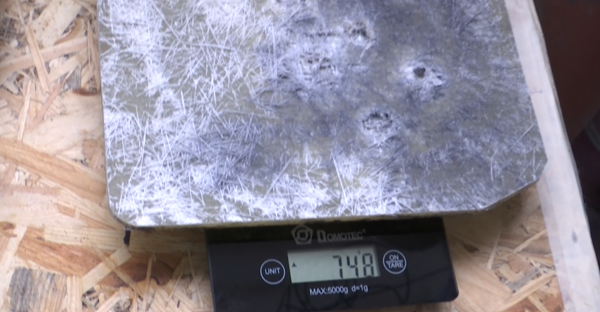 Винахід випробують на стрільбищі. Після відстрілів порівнюють броне-пластини різної товщини із захистом та без. Стальну плиту куля пробиває наскрізь. З захистом куля - ледь зігнула.