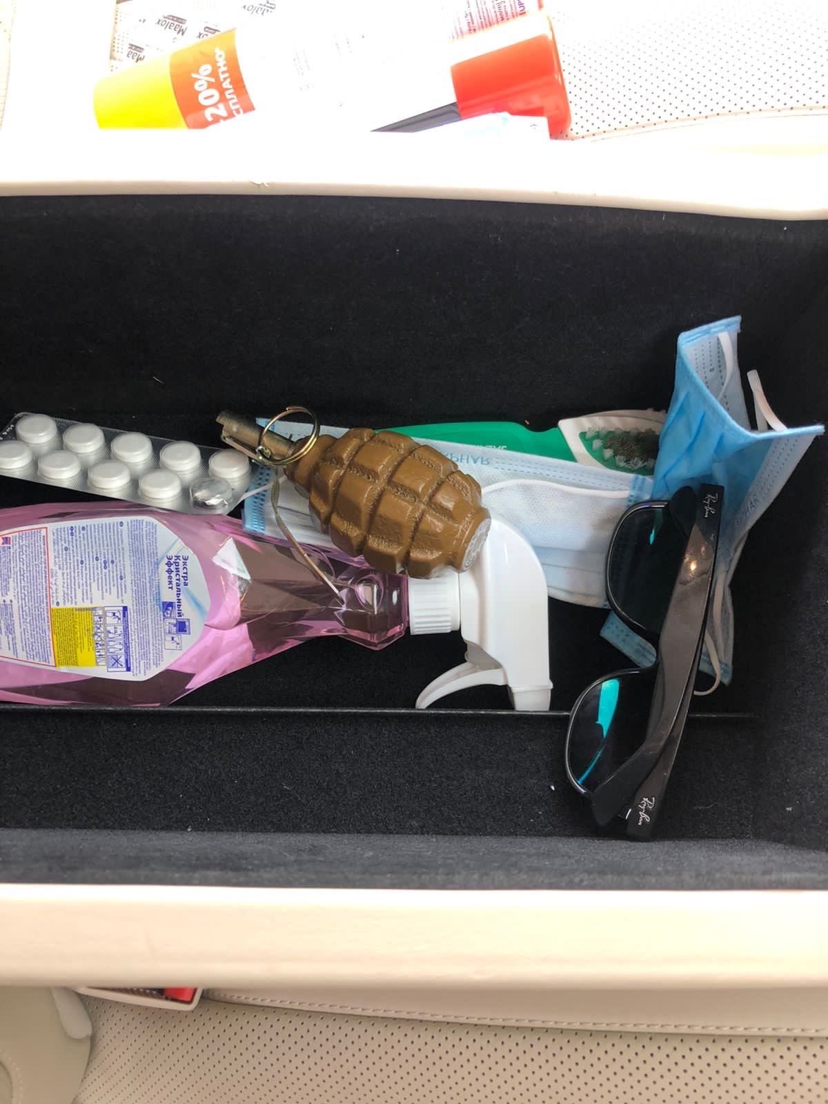 В ході подальшого спільного огляду з представниками митниці, у підлокітнику заднього сидіння автівки, правоохоронці виявили предмет, схожий на гранату «Ф-1».