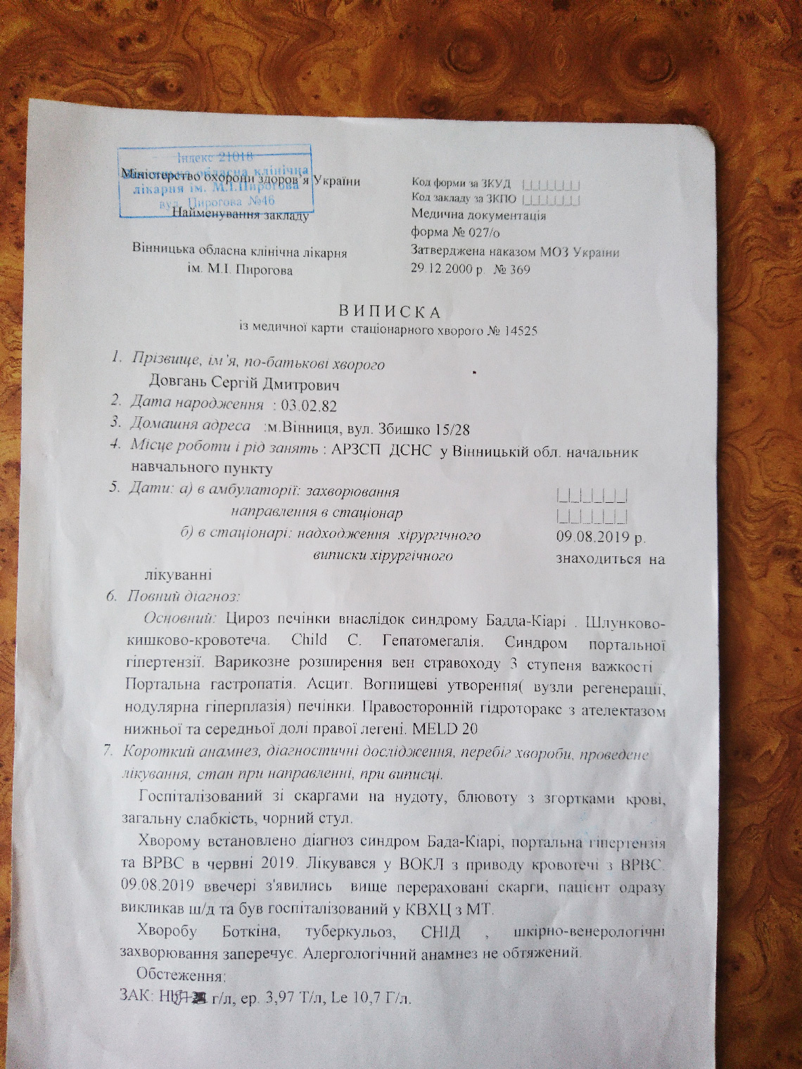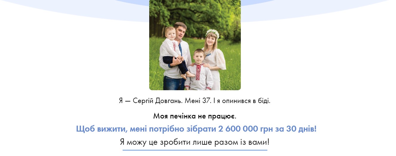 «Термінова допомога потрібна нашому колезі — рятувальнику Сергію Довганю! Його звичний життєвий ритм змінився торік, в одну мить, коли лікарі діагностували в нього рідкісну хворобу — синдром Бадда-Кіарі (тромбоз печінкових вен).
