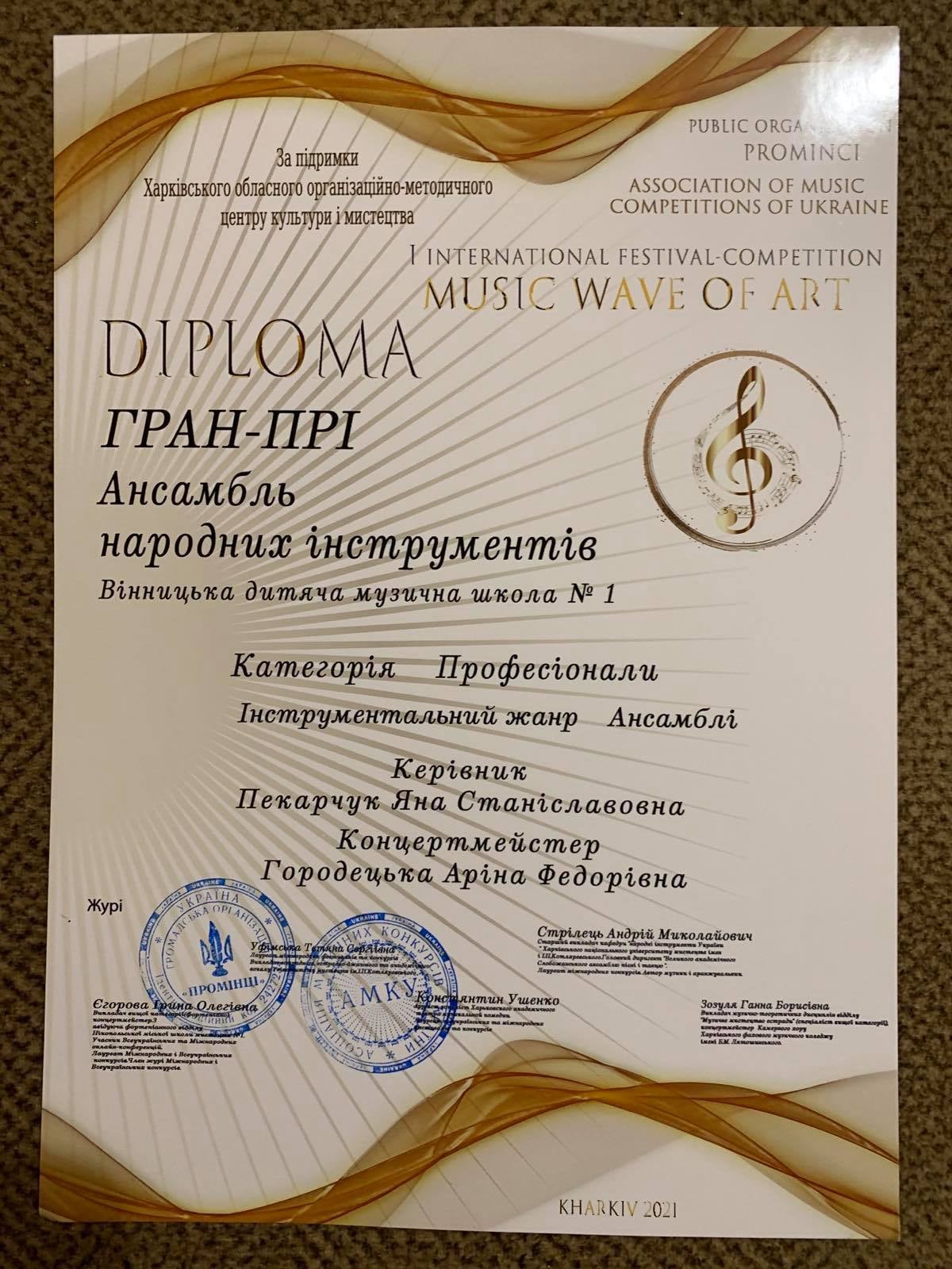 Ансамбль викладачів відділу народних інструментів Вінницької дитячої музичної школи №1 отримав Гран-прі на Міжнародному конкурсі «Music Wave oif Art». Конкурс відбувся у онлайн-форматі в місті Харків.