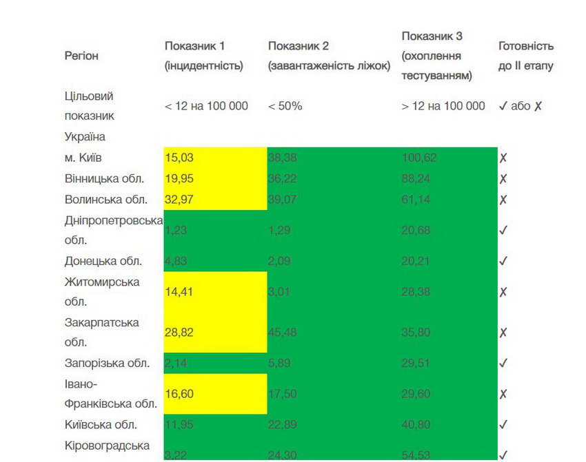 Київ, Вінницька, Волинська, Житомирська, Закарпатська, Івано-Франківська, Львівська, Рівненська, Тернопільська, Чернівецька й Чернігівська області не можуть пом’якшувати карантин через високу інцидентність коронавірусу.