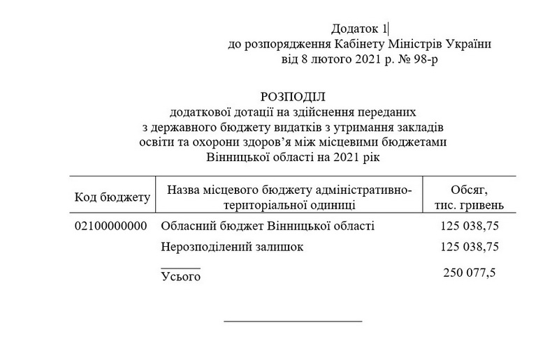 На обласний бюджет Вінницької області розподілили 250,077 млн гривень додаткової дотації на утримання закладів освіти та охорони здоров’я.