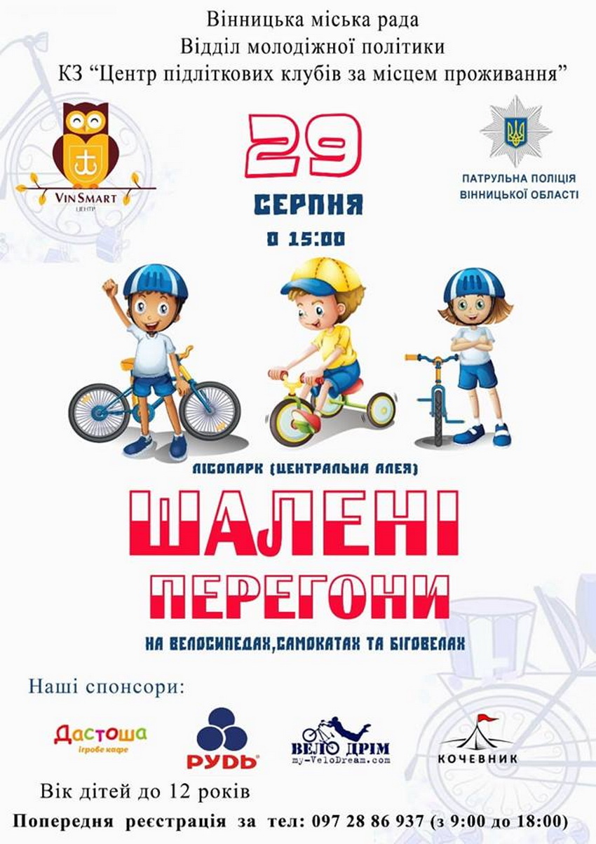 29 серпня у Вінниці планують влаштувати змагання на самокатах, біговелах та велосипедах. До участі запрошують дітей різного віку. Організатори повідомляють, що захід відбудеться на головній алеї Лісопарку (біля майданчика).