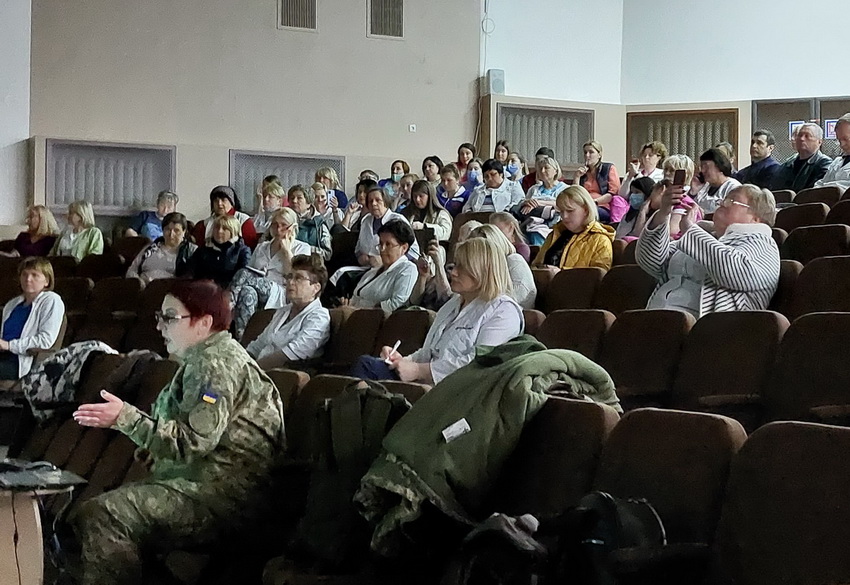 Лекції для медперсоналу читає начальник кафедри військової токсикології, радіології та медичного захисту д.мед.н, професор п-к м/с Людмила Устінова.