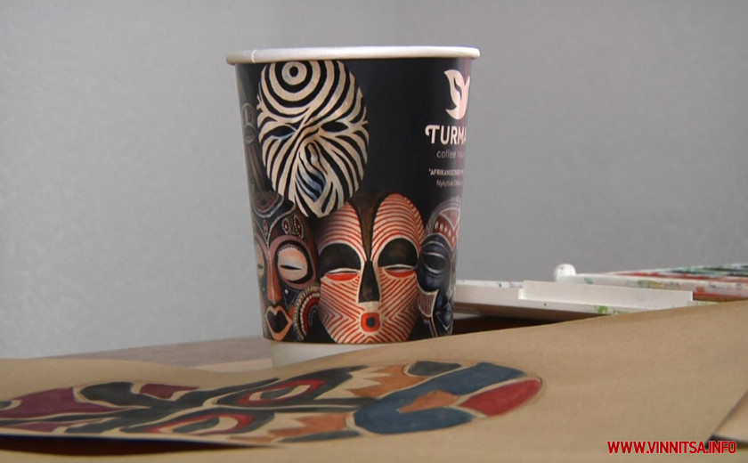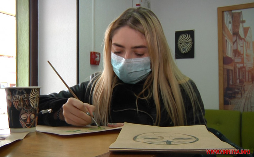 Крім масок, які розвішали по всіх кав’ярні, організатори нанесли такі ж зображення на стаканчики для кави. Відвідувачам пропонують не лише посмакувати каву і розглянути зображення, але і долучитись до творчого процесу та намалювати власну маску. Вінничанка Вероніка одна з тих, хто вирішив спробувати.