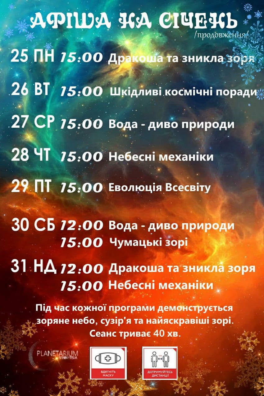 30.01 (субота) 12:00 ‒ «Вода ‒ диво природи»; 15:00 ‒ «Чумацькі зорі»;