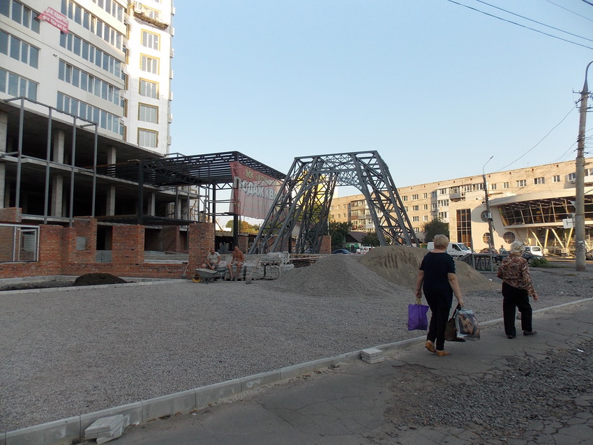 «Це буде Ейфелева вежа. А під нею басейн», - зауважують робітники, які викладають тротуарну плитку.