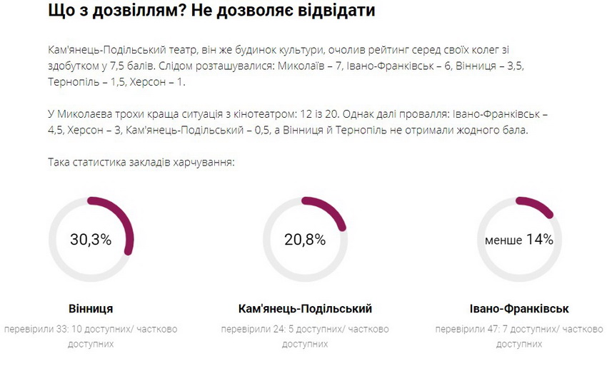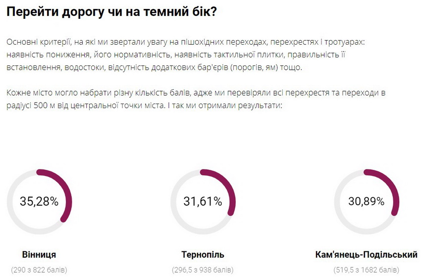 «У Тернополі з безбар'єрністю центрального залізничного вокзалу – 12 балів із 20. А решта міст сильно відстала, і жодному не вдалося набрати навіть половини з можливої кількості балів: Вінниця – 7, Херсон – 6, Миколаїв – 4, Івано-Франківськ і Кам'янець-Подільський – по 2. Хоч Івано-Франківськ і Кам'янець-Подільський набрали однакову кількість балів, у Франківську значно простіше і зручніше скористатися вокзалом.