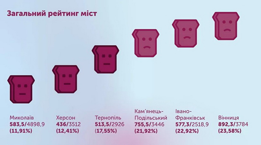 «23,5% доступності — з таким результатом увірвалась Вінниця на першу сходинку і нашого рейтингу доступності «Тостер». Плюси міста: облаштування вулиць, співпраця влади та громадськості, велодоріжки. Мінуси міста: міська лікарня, автовокзал, кінотеатр», – йдеться в дописі від «Тостер».