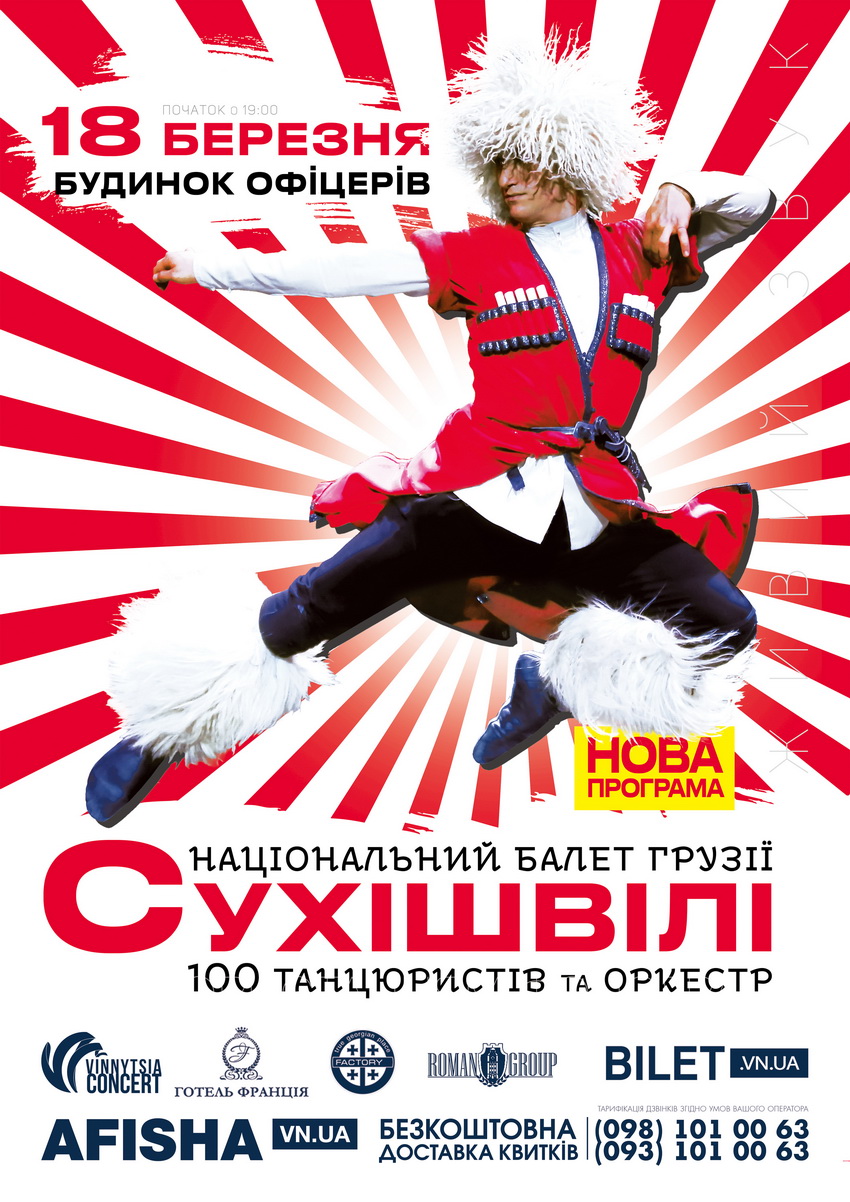 - Концерт «Сухішвілі» – це свято танцю, яке без перебільшення неможливо забути! Дивовижною технікою їхнього танцю, що кидає виклик законам гравітації, й досконалою точністю рухів захоплюються мільярди глядачів по всьому світу. Аншлаги супроводжують «Сухішвілі» завжди і всюди. Не стане винятком і новий концерт у Вінниці. За місяць до концерту у продажу залишились лічені квитки, - зазначають організатори гастролей – компанія «ВІННИЦЯКОНЦЕРТ». – Тому усім, хто хоче побачити грандіозне шоу, у якому втіляться грація, енергія і вишукана геометрія танцю, радимо не зволікати із замовленням квитків. Вся краса хореографії «Сухішвілі» 18 березня о 19.00 сконцентрується на сцені вінницького Будинку офіцерів. Обов'язково приходьте, щоб побачити все на власні очі!