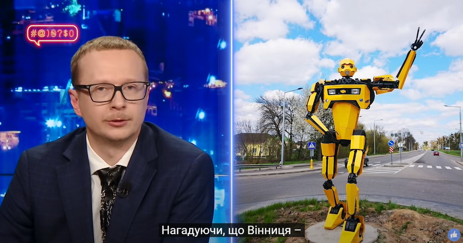 А що у Вінниці ще є цікавого, окрім забальзамованого тіла Миколи Пирогова? Ну, наприклад, віднедавна на в’їзді до Вінниці стоїть трансформеру , нагадуючи, що Вінниці високотехнологічне та футуристичне місто. Дехто почав жалітися, що трансформер відволікає водіїв, але цей аргумент видається дивним», – кажуть ведучі.