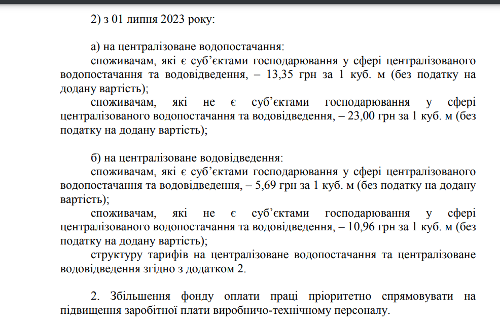 на централізоване водопостачання – 23,00 грн за 1 куб. м (без ПДВ)