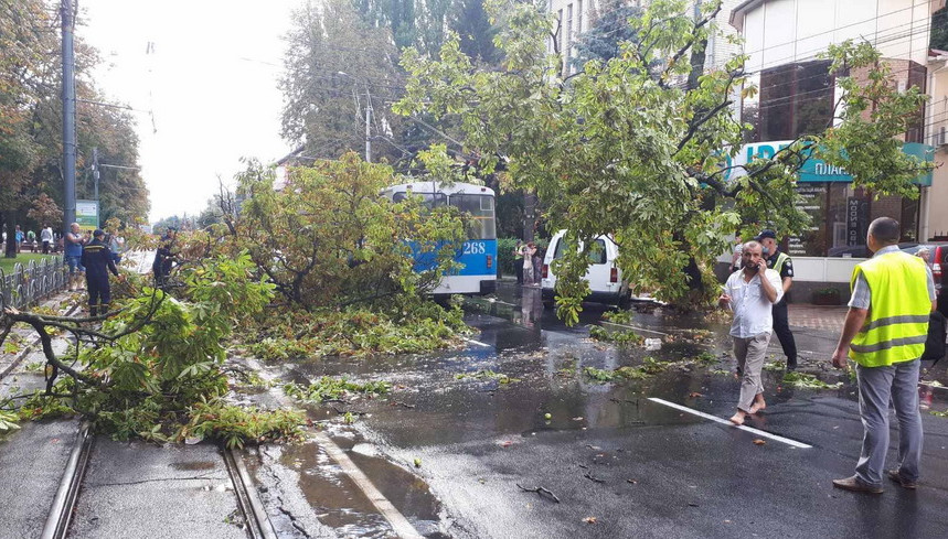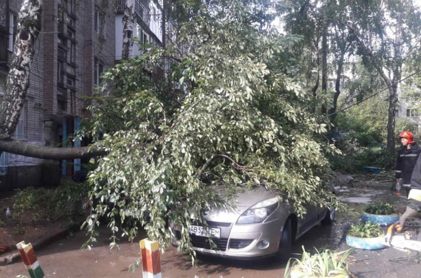 У центрі Вінниці через велику кількість води, на проїжджій частині дороги утворилися великі калюжі. А на деяких вулицях старі дерева попадали на дорогу.