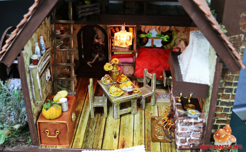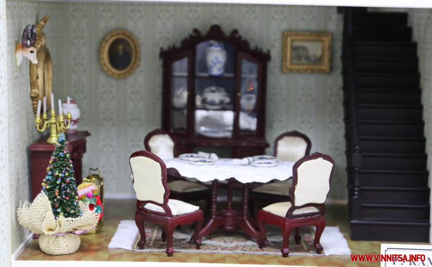 Є кілька лялькових будиночків, де затишно світиться світло. Серед них – триповерховий будинок у вікторіанському стилі. На першому поверсі столова та кухня, другий поверх – вітальня та ванна кімната, третій поверх – спальня та дитяча кімната.