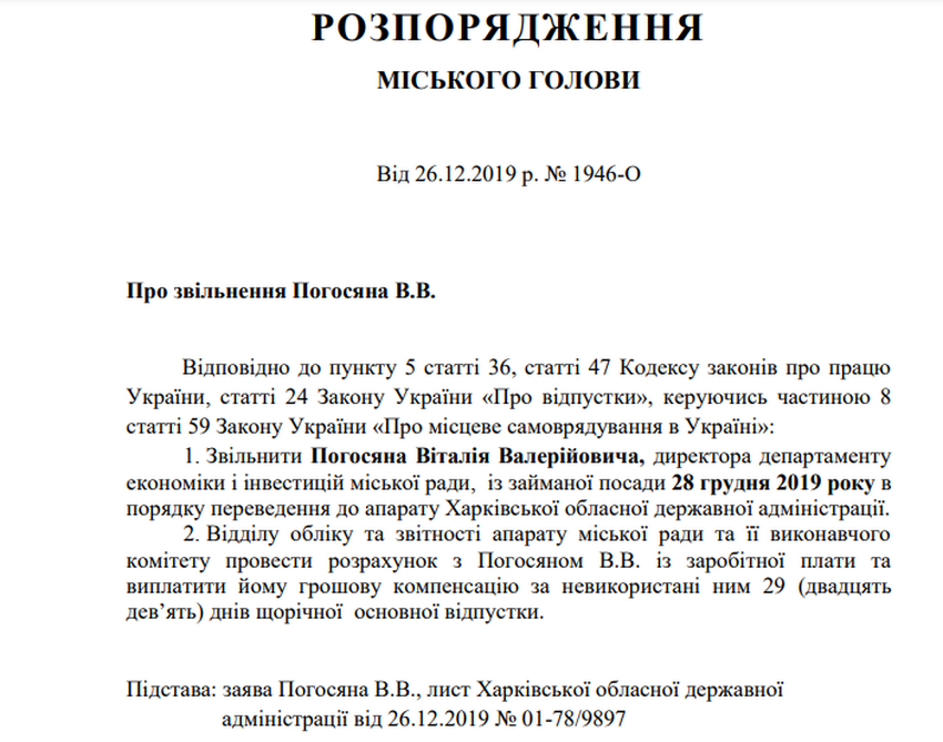 Разом з тим на сайті Вінницької міської ради опублікували розпорядження мера, в якому зазначається, що підставою для звільнення Віталя Погосяна стала його заява та лист із Харківської ОДА. Посадовець працюватиме у Харківській обласній державній адміністрації.