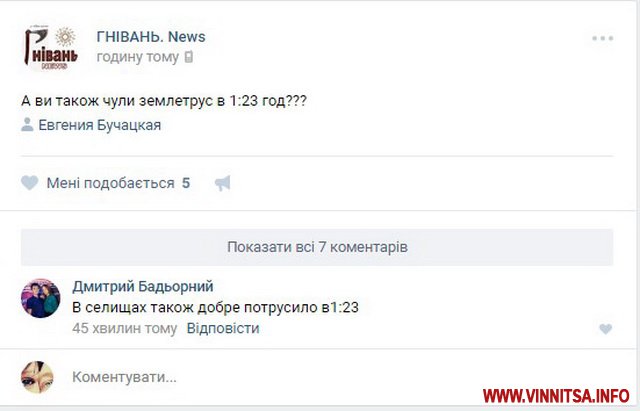 «Вночi, десь о 1:27 в мене в коридорі задрижав комод з дзеркалом, все що було на ньому почало від вібрації рухатися, через пару секунд в буфеті почав дзвеніти посуд і захиталася люстра. Все це тривало секунд 10»- розповідає дівчина.