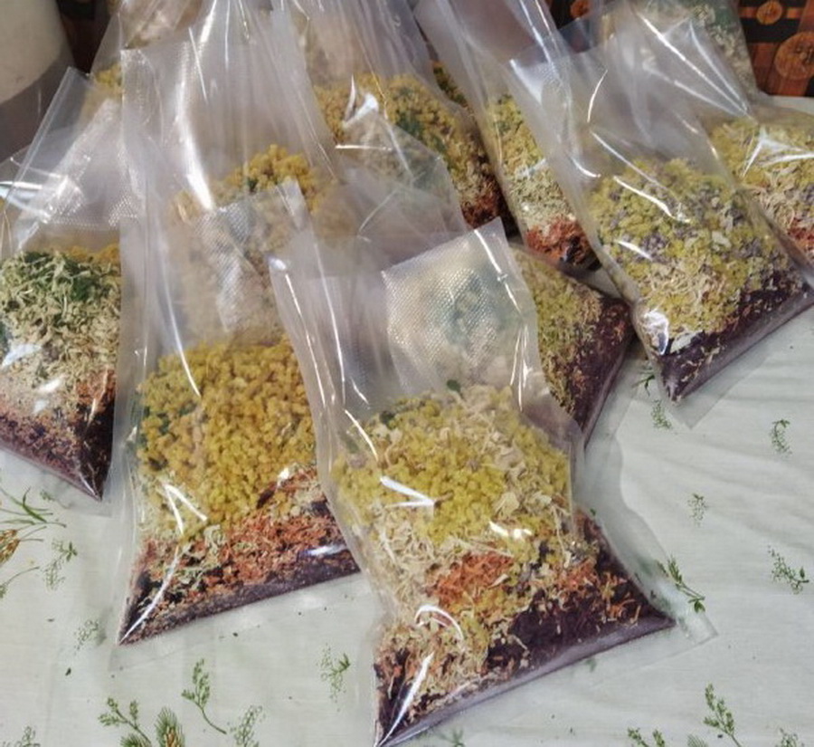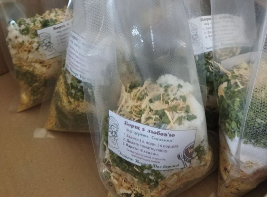 В сухі борщі волонтери додають м'ясо та квасолю. М'ясо перед тим відварюють, перемелюють, а потім висушують. Вручну всі овочі складають і фасують у спеціальні вакуумні пакети.