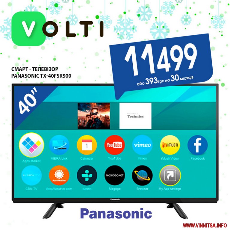 - 40-дюймовий телевізор Panasonic TX-40FSR500 за 11 149 гривень. Або у розстрочку всього за 393 гривні на 30 місяців.