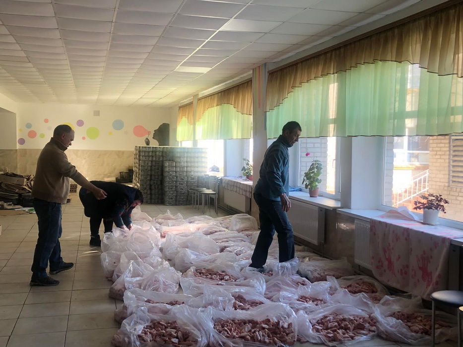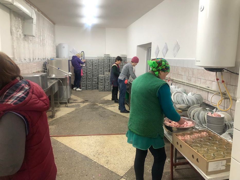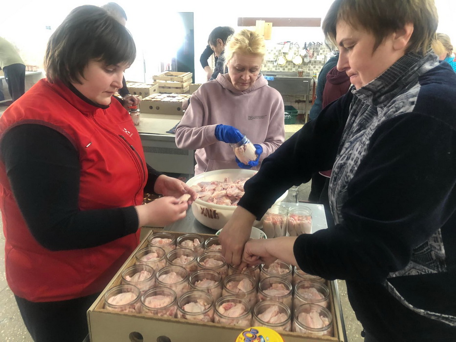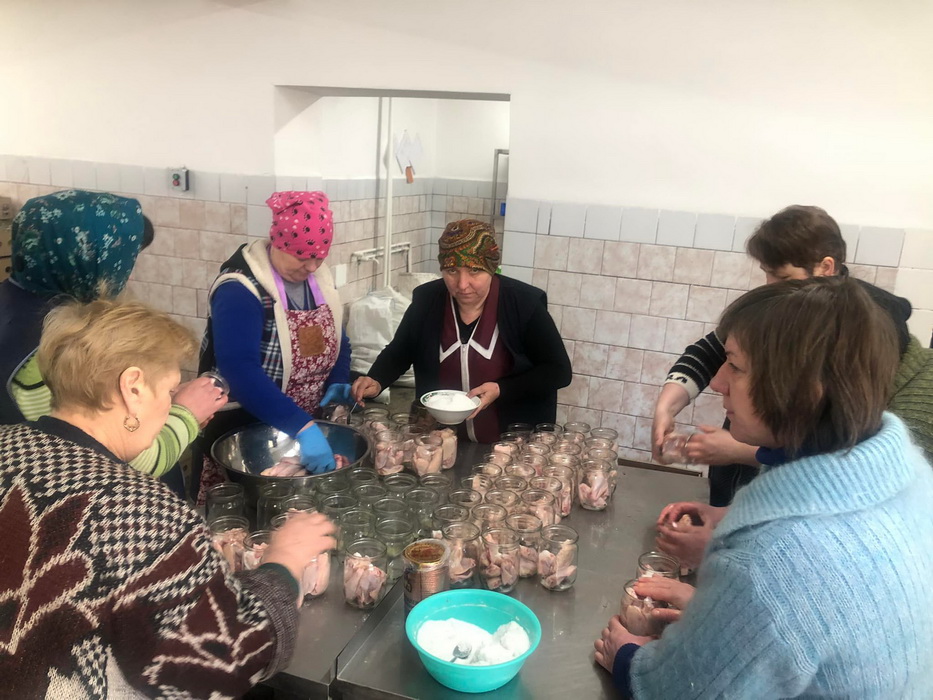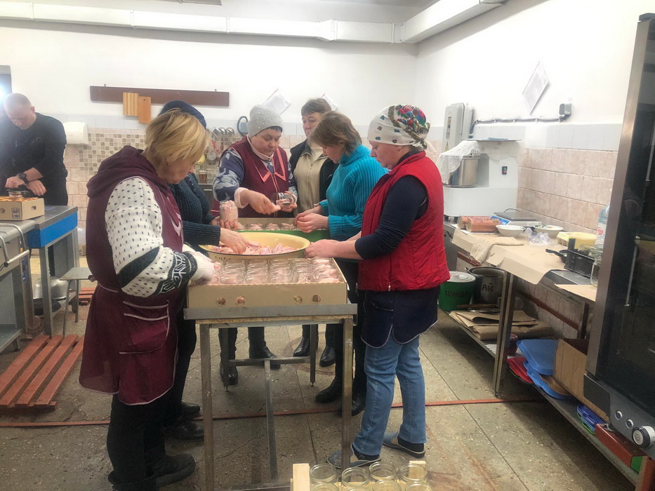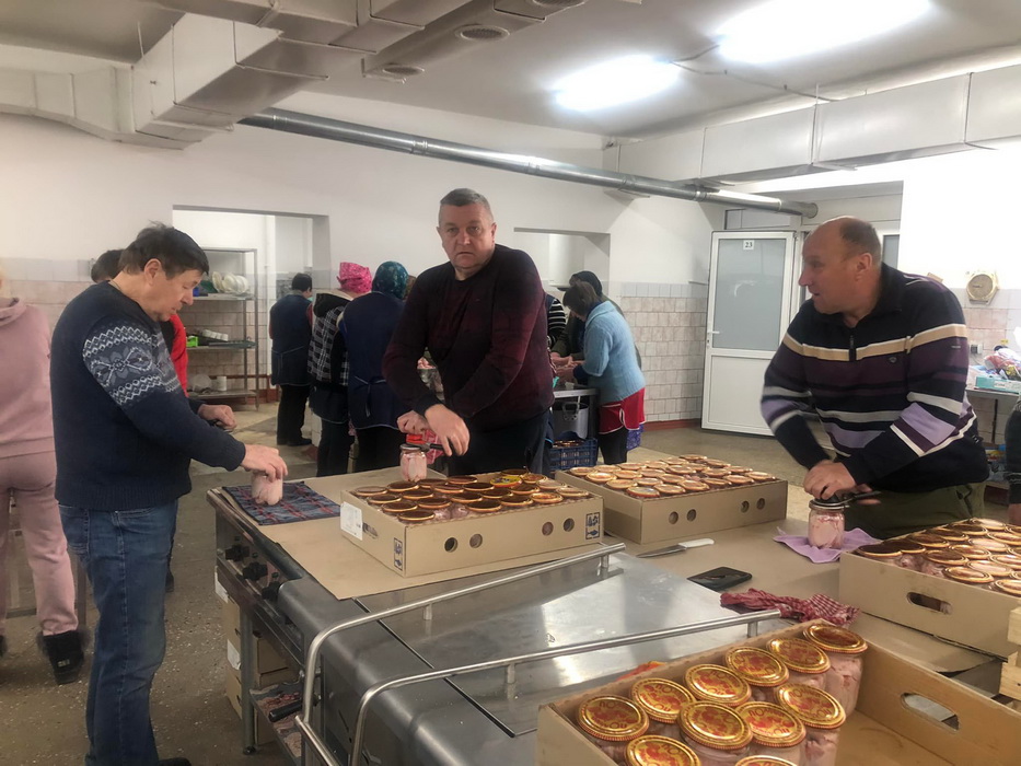 А також додає фото з процесу приготування тушонки громадою. Жінки займаються кулінарним процесом, а чоловіки закручують банки.